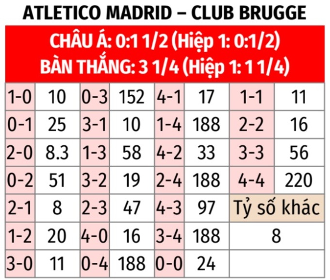 - Tối thiểu 2 bàn hiệp 1: 6/8 trận đấu gần đây của Atletico xuất hiện từ 2 bàn thắng trở lên trong hiệp 1. 4/5 trận vừa qua của Club Brugge ở Champions League xảy ra tình trạng tương tự.