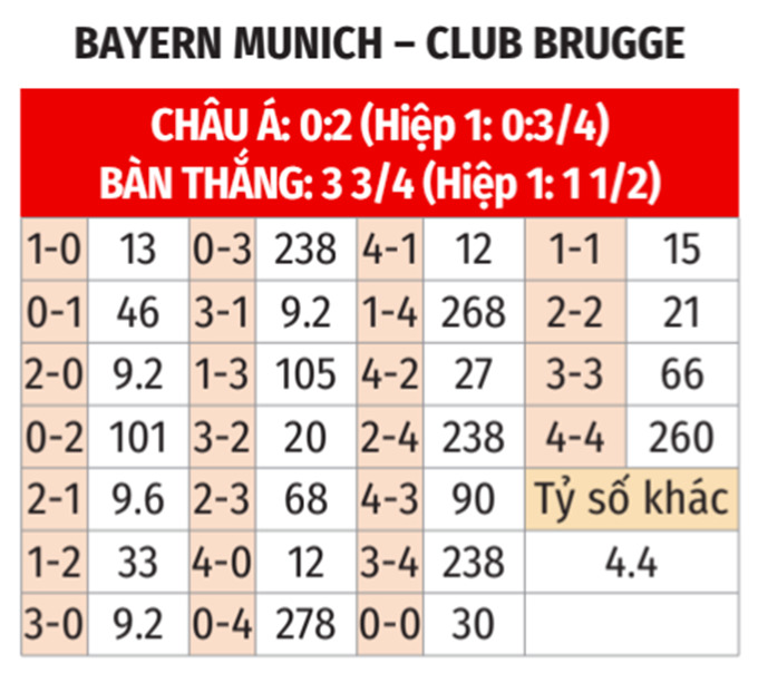 - Bayern Munich thắng theo châu Á: Bayern Munich thắng 6/7 trận gần nhất, thắng 4/5 trận sân nhà vừa qua. Trong khi đó, Club Brugge không thắng 4/6 trận gần đây, thua 6/9 chuyến làm khách gần đây. Do đó, có thể đặt niềm tin vào Bayern Munich ở trận này.
