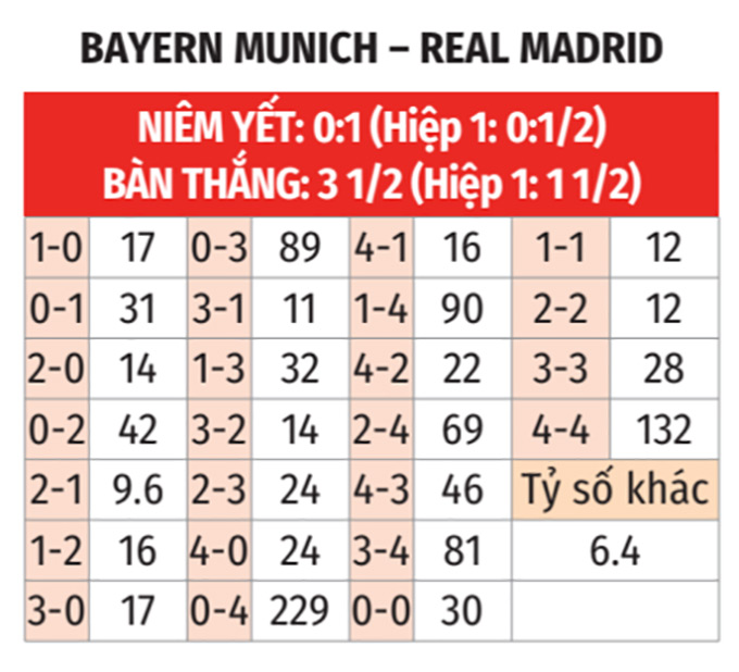 - Tỷ số lẻ: 12/13 trận gần đây của Real kết thúc với tỷ số lẻ. 3 trận vừa qua của Bayern cũng có số bàn thắng không chia hết được cho 2.