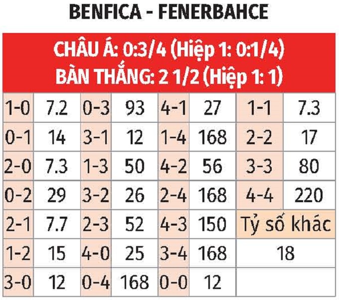 - Tối đa 4 góc hiệp 1: Trận đối đầu ở lượt đi cách đây một tuần có tổng cộng 8 quả góc chia đều cho hai đội, nhưng hiệp 1 khép lại với chỉ 3 lần bóng được đặt ở bốn cột góc cuối sân. Tính xa hơn, 3/4 trận đối đầu gần nhất có tối đa 4 góc trong hiệp 1, và kịch bản này hoàn toàn có thể tái diễn giữa tuần này. Nói thế là bởi, 5/6 trận gần đây của Fenerbahce đều có nhiều nhất 4 quả góc trong 45 phút đầu tiên. Với Benfica, đội chủ nhà chỉ phải chịu 9 quả góc trong hiệp 1 ở 6 trận gần nhất.