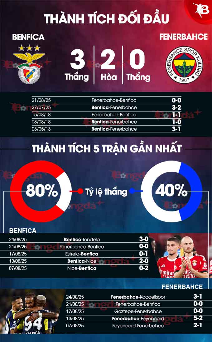 Niềm tin dành cho Benfica bên cạnh phong độ ổn định, lợi thế sân nhà mà còn ở thành tích đối đầu. Trước trận quyết định vòng play-off giữa tuần này, Benfica đã thắng một nửa trong số 8 lần gặp Fenerbahce trước đó và chỉ để thua 1 lần. Nếu tính gần hơn, Fenerbahce đã thua 3 trong 5 lần chạm trán gần nhất, bao gồm trận giao hữu thua 2-3 vào tháng trước.