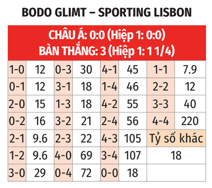 - Tỷ số lẻ: 3/4 trận gần đây của Bodo/Glimt kết thúc với tỷ số lẻ. 4/5 trận vừa qua của Sporting Lisbon số bàn thắng cũng không chia hết được cho 2.