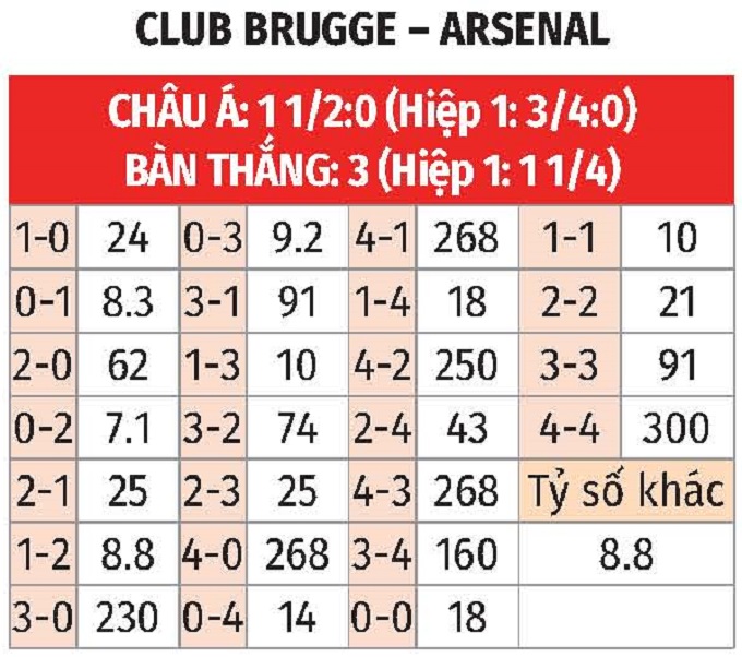 - Tối đa 3 bàn thắng: 5/6 trận gần đây của Club Brugge đều kết thúc với nhiều nhất 3 bàn thắng được ghi. Với Arsenal, 3 trận vừa qua của đội khách cũng xuất hiện nhiều nhất 3 tình huống làm bàn.