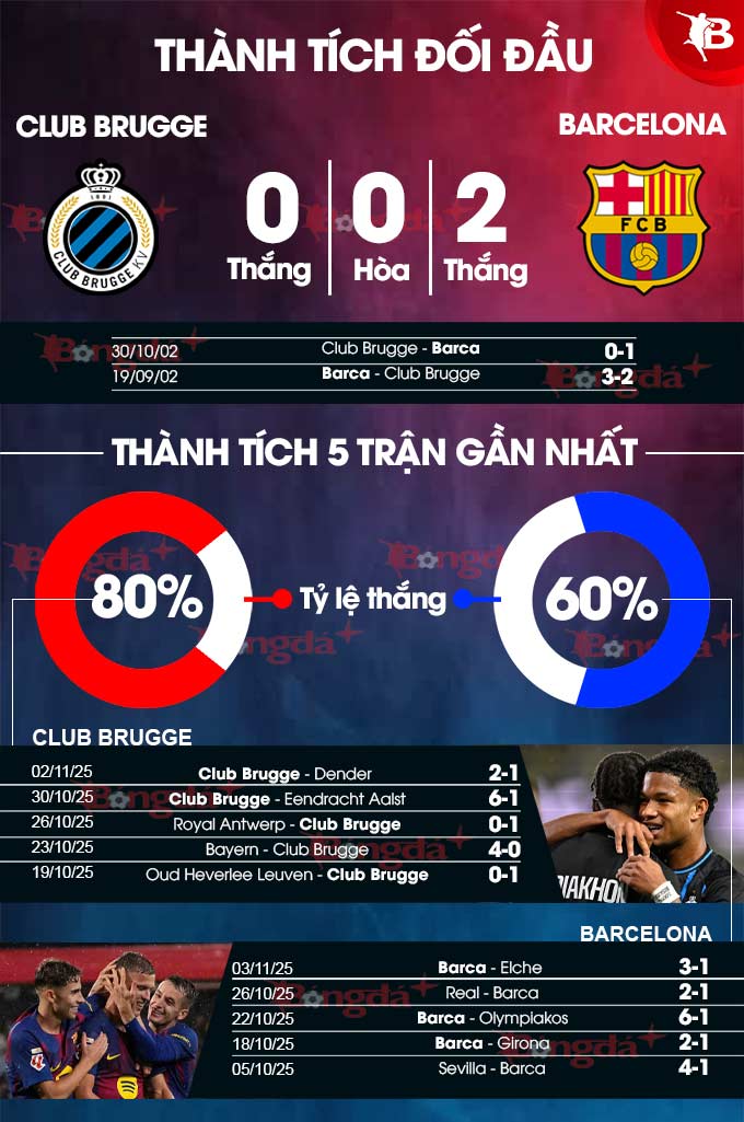 - Lẻ bàn thắng: 2 trận đối đầu gần nhất giữa 2 đội có tổng bàn thắng không chia hết cho 2. Ngoài ra, 7/8 trận vừa qua của Club Brugge và 6/8 trận vừa xong của Barca chứng kiến điều tương tự.