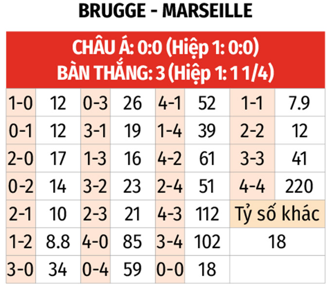 - Nhiều bàn thắng: 5 trận liên tiếp gần đây của Marseille đều kết thúc với ít nhất 3 bàn thắng được ghi. 5/6 trận vừa qua của chủ nhà Club Brugge thậm chí xuất hiện tối thiểu 4 tình huống làm bàn.
