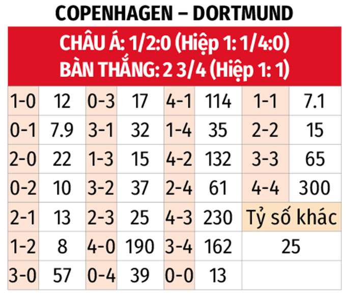 - Từ 3 bàn thắng trở lên: 2 trận đấu tại vòng phân hạng Champions League của Dortmund đều kết thúc với ít nhất 5 bàn thắng. 6/9 trận vừa qua của Copenhagen cũng xuất hiện ít nhất 3 tình huống làm bàn.