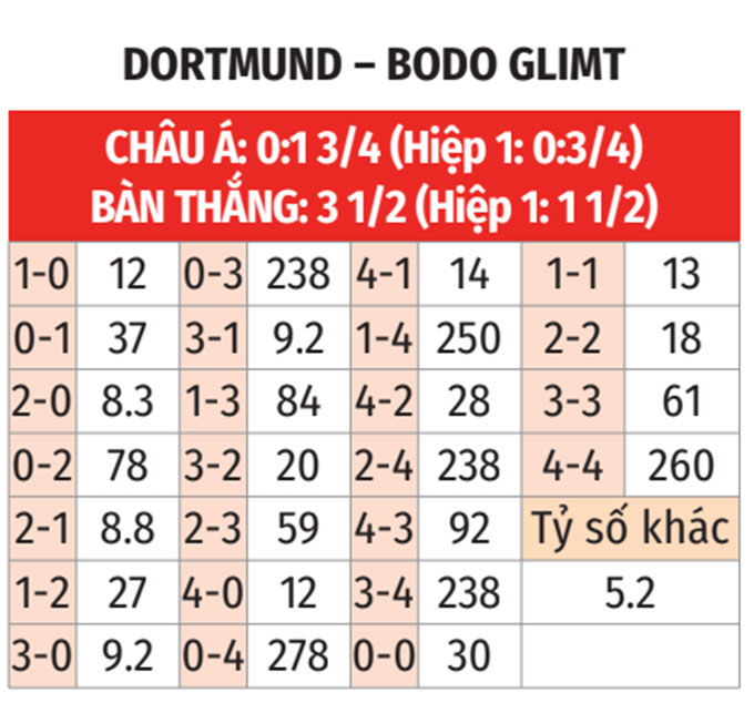 - Dortmund thắng theo châu Á: Trong khi Bodo/Glimt đang có chuỗi 3 trận thua theo châu Á liên tiếp ở Champions League, thì điều ngược lại xảy ra với Dortmund ở 3/4 trận vừa qua. Khi Dortmund có duyên như vậy, đặt niềm tin vào họ là giải pháp khá an toàn.