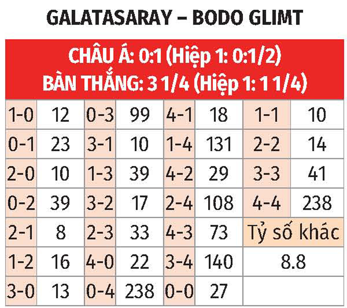 Phong độ của Galatasaray vs Bodo Glimt đều đang rất ổn ở thời gian này. Tuy nhiên, Galatasaray lại có lợi thế sân nhà, đội hình chất lượng hơn Bodo Glimt. Do đó, Galatasaray nhiều khả năng sẽ có 3 điểm.