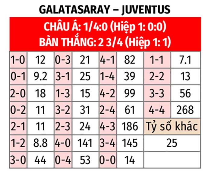 - Galatasaray thắng theo châu Á: Trong khi Galatasaray thắng theo châu Á 3/4 trận gần nhất, thì điều ngược lại xảy ra với Juventus ở cả 3 trận vừa qua. Với xu hướng như vậy, các nhà đầu tư không nên đặt niềm tin vào đội khách.