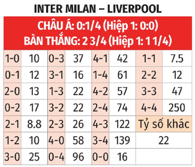- Tối đa 4 góc hiệp 1: Mặc dù 2 trận đối đầu gần nhất giữa hai đội đều xuất hiện từ 5 góc trở lên trong hiệp đầu tiên, nhưng kịch bản này nhiều khả năng sẽ khó có thể tái diễn. Nói thế là bởi các trận đấu gần đây của đôi bên đều không chứng kiến tình trạng "cày góc" sớm, khi 5/6 trận gần đây của Inter Milan cùng 3 trận liên tiếp vừa qua của Liverpool đều có tối đa 4 góc trước giờ nghỉ.