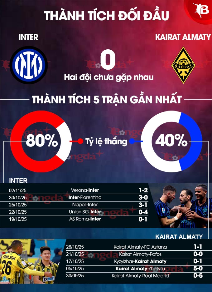 - Chỉ một đội ghi bàn: Inter hướng đến mục tiêu trở thành đội bóng thứ tư trong lịch sử giành chiến thắng 4 trận liên tiếp tại Champions League mà không để thủng lưới bàn nào, mỗi trận đều ghi từ hai bàn trở lên - một thành tích trước đây thuộc về Bayern (2012/13), Dortmund (2014/15) và PSG (2017/18). Kairat Almaty thực lực yếu và không ghi bàn ở 6/7 trận Champions League gần nhất nhiều khả năng sẽ khó xuyên thủng được hàng thủ đội chủ nhà.