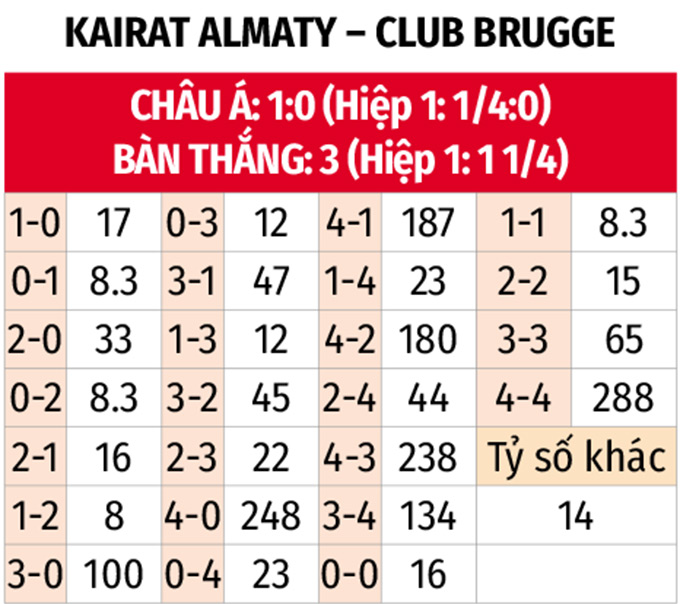 - Hiệp 1 có bàn thắng: 9 trận liên tiếp gần đây của Club Brugge đều có ít nhất 1 bàn thắng trong hiệp đầu tiên, trong đó có 6 trận xuất hiện tối thiểu 2 lần lưới rung. Với Kairat Almaty, 4/6 trận vừa qua của đội chủ nhà tại đấu trường châu lục cũng có bàn thắng trước giờ nghỉ. Với mức tổng bàn thắng 1 1/4 hiệp 1, có thể chờ giảm về 1 hòa hoặc 3/4 để cổ vũ nhiều bàn.