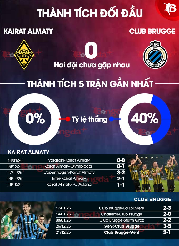 - Ít bàn thắng: 5/7 trận gần đây của Kairat Almaty đều kết thúc với nhiều nhất 2 bàn thắng. Với Club Brugge, các chân sút đội khách tịt ngòi 3/4 trận vừa qua tại đấu trường Champions League.