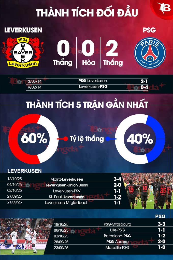 Ngoài ra, trước cuộc đón tiếp PSG lần này, đội bóng của HLV Kasper Hjulmand không có phong độ tốt trên sân nhà. Họ chỉ thắng 2, hòa 2 và thua 2 ở 6 trận chính thức gần nhất. Ở trận đầu tiên tại BayArena trong khuôn khổ vòng phân hạng Champions League 2025/26, họ bị PSV cầm hòa trong trận cầu mà các chân sút thi đấu rất thiếu hiệu quả.