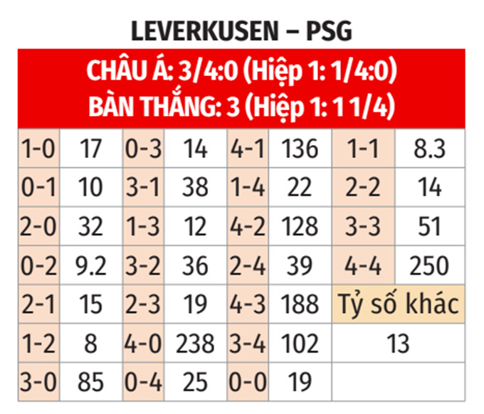 - 2 hoặc 3 bàn cả trận: 4/5 trận gần nhất của Leverkusen và 3/4 trận vưa qua của PSG đều có 2 hoặc 3 bàn thắng cả trận. Không những thế, 5/6 trận sân nhà gần đây của Leverkusen và cả 2 trận xa nhà gần nhất của PSG cũng có từ 2-3 bàn cả trận. Xem ra, trận này khó có ngoại lệ.