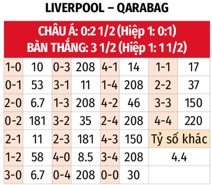 - Nhiều bàn thắng: 4/5 trận gần đây của Qarabag tại Champions League đều có ít nhất 4 bàn thắng được ghi. Với Liverpool, 4/6 trận vừa qua của đội chủ nhà cũng có từ 3 lần lưới rung trở lên, trong đó có 3 trận có tối thiểu 4 bàn. Có thể chờ giảm 3 hòa để cổ vũ mưa bàn thắng.