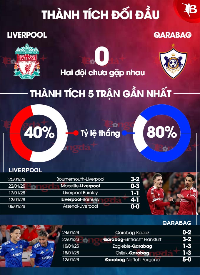 Tuy nhiên, đây sẽ là thử thách không hề dễ dàng khi họ có chuyến hành quân tới sân Anfield, nơi Liverpool vượt trội về đẳng cấp đang chờ sẵn. Cú hích dành cho Qarabag là chiến thắng nghẹt thở 3-2 trước Eintracht Frankfurt ở lượt trận gần nhất tại vòng phân hạng Champions League, nhưng trong trận ra quân cuối tuần trước họ lại để thua tại giải VĐQG trước đối thủ yếu Kapaz.