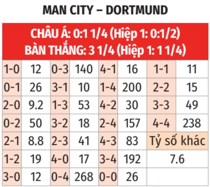 - Tối đa 1 bàn hiệp 1: Cả 8 lần đối đầu giữa 2 đội gần đây đều chỉ có tối đa 1 bàn trong hiệp 1. 3/4 trận sân nhà gần đây của Man City ở các giải đấu Cúp và 4/5 trận gần nhất của Dortmund xảy ra tình trạng tương tự.