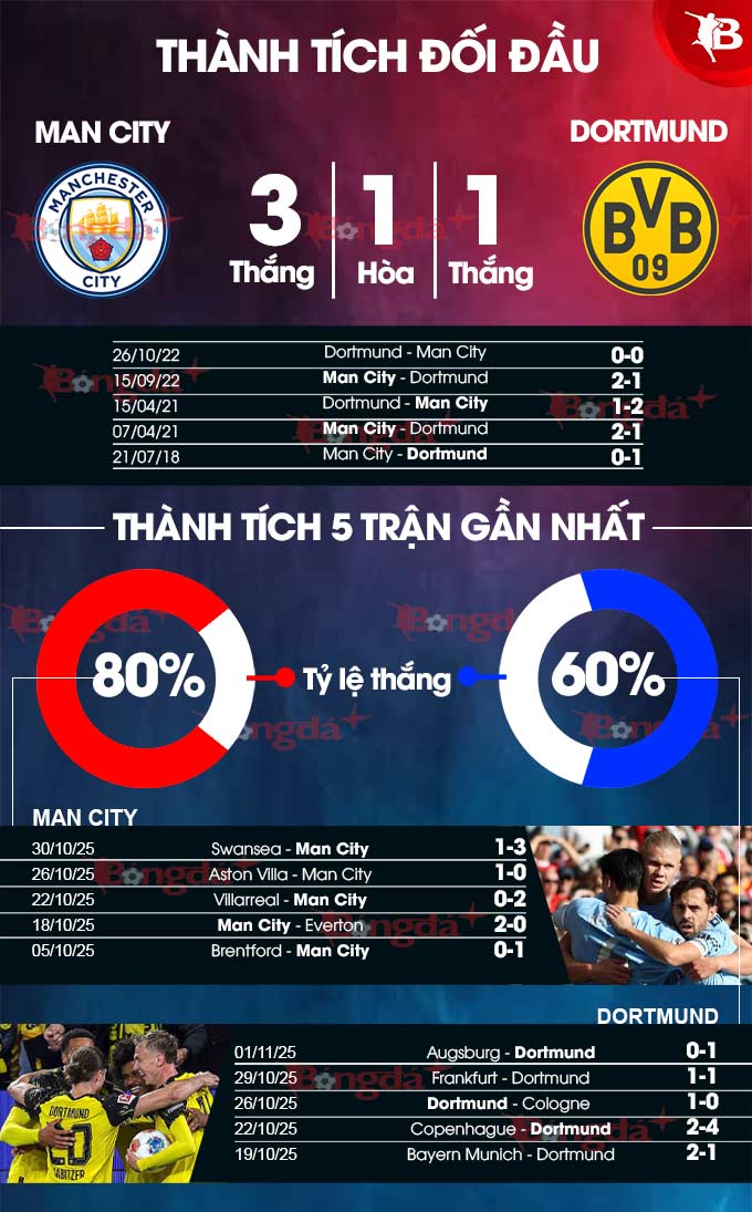- Chẵn bàn thắng: 9/11 trận đấu gần đây của Man City kết thúc với tổng bàn thắng là số chẵn. 6/8 trận sân khách vừa qua của Dortmund xảy ra tình trạng tương tự.