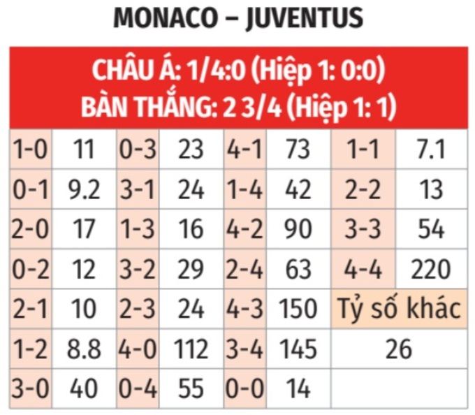 - Tối đa 1 bàn hiệp 1: 4/5 lần đối đầu giữa 2 đội gần đây chỉ có nhiều nhất 1 bàn thắng trong hiệp 1. 3/4 trận gần đây của Monaco và 11/12 trận mới nhất của Juve xảy ra tình trạng tương tự.