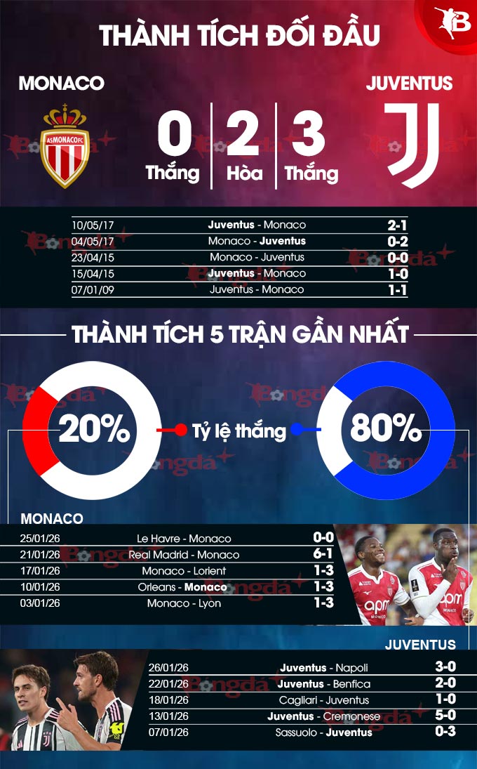 Chưa kể, Juve đá sân khách không đến nỗi tệ trong thời gian gần đây. Theo quan sát, đội bóng thành Turin thắng ở 3/4 chuyến hành quân gần nhất. Kết quả này chắc chắn sẽ khiến họ tự tin hơn khi hành quân đến sân Louis II của Monaco. Cũng phải nhấn mạnh rằng, Monaco chưa bao giờ xứng tầm đối thủ với Juve. Cụ thể, ở 4 cuộc đụng độ gần nhất giữa 2 đội ở Champions League, Juve áp đảo với thành tích thắng 3, hòa 1.