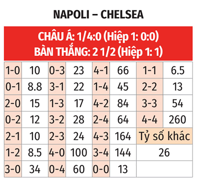 - Chelsea thắng theo châu Á: Trong khi Chelsea thắng theo châu Á 5/6 trận sân khách gần đây, thì Napoli đang có chuỗi 4 trận thua theo châu Á liên tiếp. Khi đội chủ nhà tỏ ra kém duyên như vậy, các nhà đầu tư nên ủng hộ đội khách chứ không phải Napoli.