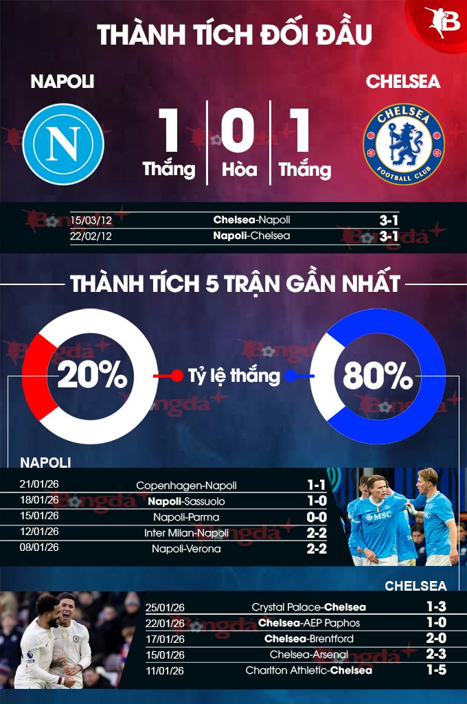 Xét về phong độ, chính các cầu thủ Napoli mới là những người phải lo lắng do họ mới để thua Juventus tới 0-3. Trận đấu này là lần thứ 5 họ không thể giành chiến thắng trong 6 trận gần nhất. Về phần mình, Chelsea kể từ khi được tiếp quản bởi tân HLV Liam Rosenior đã hạ 4 đối thủ trong 5 trận vừa qua. Với những gì đang thể hiện, họ đủ khả năng phá tan pháo đài kiên cố Maradona để khiến Napoli phải ôm hận.