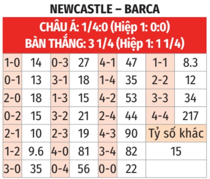 - Lẻ bàn thắng: 7/9 trận đấu gần đây của Newcastle kết thúc lẻ bàn thắng. Tình trạng tương tự xảy ra ở 7/8 trận vừa qua của Barca.