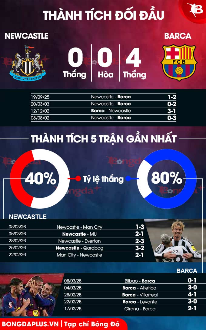 Để thấy được sự chênh lệch giữa 2 đội, có thể nhìn vào thống kê về đối đầu. Theo quan sát, Barca áp đảo khi toàn thắng trong 4 lần chạm trán Newcastle gần đây. Trong đó, ở trận đấu tại vòng phân hạng UEFA Champions League hồi tháng 9 năm ngoái, đội bóng xứ Catalunya giành chiến thắng 2-1 ngay ở sân St. James’ Park nhờ cú đúp của tiền đạo Marcus Rashford.