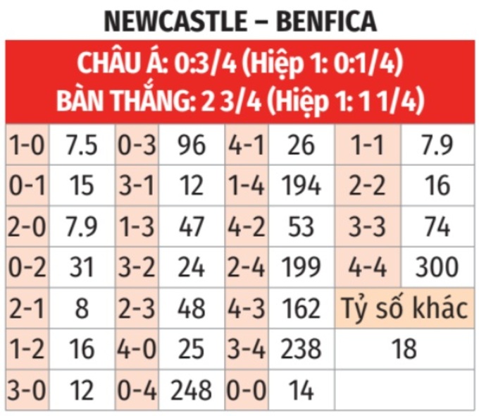 - Hai đội đều ghi bàn: 2 đội xé lưới của nhau ở 3 lần chạm trán trong lịch sử. Newcastle ghi bàn ở 5 trận liên tiếp gần đây. Benfica cũng xé lưới đối phương ở 17/20 trận sân khách vừa qua.