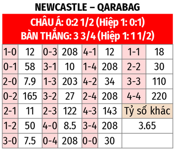 - Newcastle thắng theo châu Á: Newcastle dù thắng 6-1 ở lượt đi nhưng vẫn nhường tới 2 1/2 trái ở màn tái đấu này, cho thấy các nhà đầu tư vẫn có niềm tin rất lớn dành cho đội chủ nhà, những người thắng theo châu Á 3, hòa 1 ở 4 trận gần đây. Với Qarabag, đội khách thua theo châu Á 7 trận liên tiếp vừa qua.
