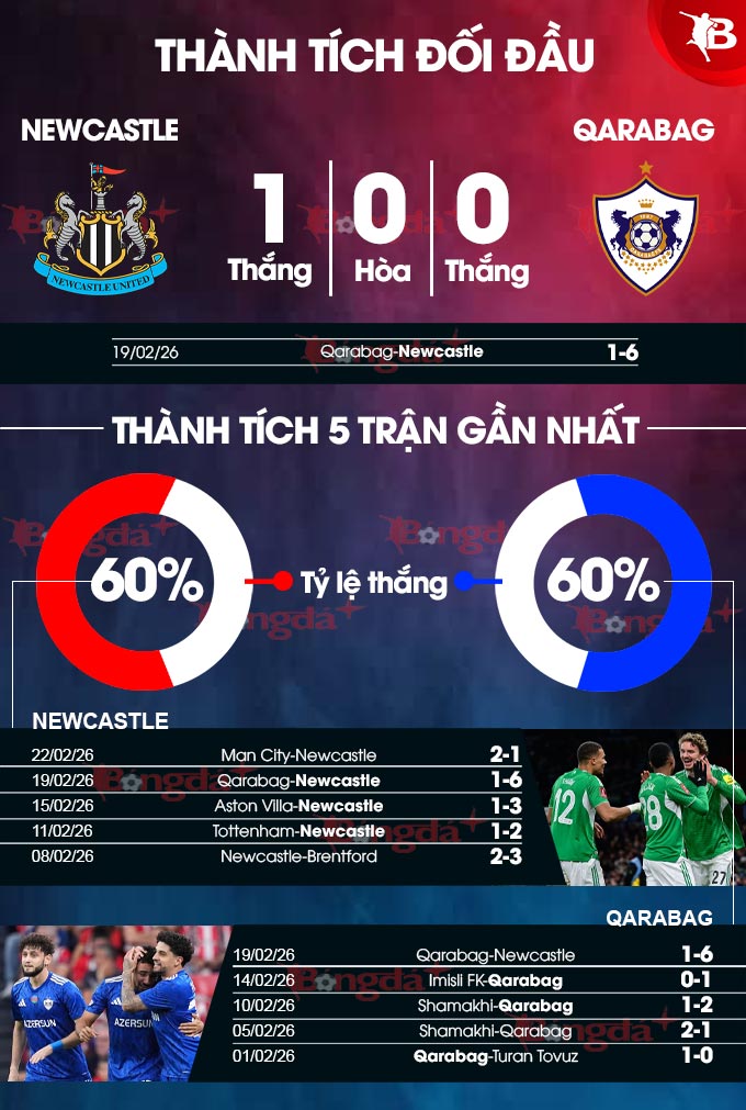 Thực tế, Qarabag đã để thủng lưới 6 bàn trong 2 trận đấu liên tiếp tại Champions League sau khi từng bị Liverpool đánh bại, đồng thời để thủng lưới nhiều hơn 1 bàn trong mỗi 6 trận đấu của họ tại giải đấu danh giá nhất châu Âu. Trước một Newcastle vượt trội về đẳng cấp, có lẽ đại diện Azerbaijan sẽ chỉ nên hy vọng đừng để thua quá đậm.