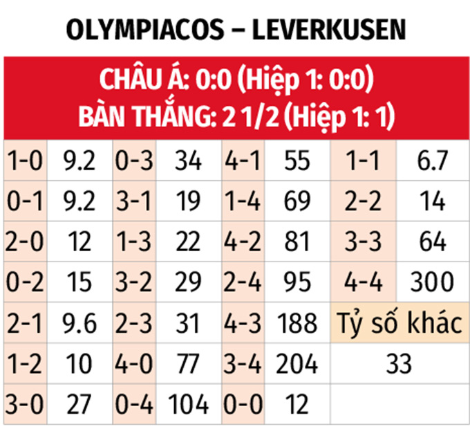 - Ít bàn thắng: Những trận đấu có sự góp mặt của Olympiakos thời gian qua thường diễn ra với thế trận rất chặt chẽ và kín kẽ, khi 9/11 trận gần đây đều có không quá 2 bàn thắng được ghi. Với Leverkusen, 3/4 trận sân khách vừa qua cùng 2 trận đối đầu gần nhất có tối đa 2 pha làm bàn.