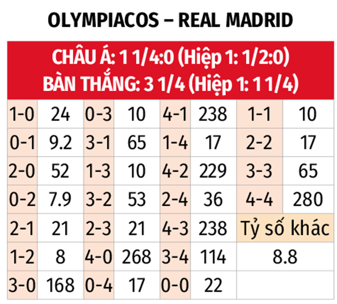 - Olympiakos thắng châu Á hiệp 1: Đội chủ nhà đang nhập cuộc tương đối chủ động, thắng theo cả chuyên môn và tỷ lệ châu Á ở 5/6 trận gần đây ngay trong hiệp 1. Trong khi đó, Real Madrid thua châu Á hiệp 1 ở 6/8 trận vừa qua cùng 2 trận đối đầu gần nhất.