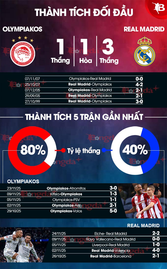 - Nhiều bàn thắng: 4/5 trận gần đây của Olympiakos cùng 3/5 trận vừa qua của Real Madrid đều xuất hiện ít nhất 3 bàn thắng. Lịch sử đối đầu cũng chứng kiến 3/4 trận gặp nhau gần nhất giữa đôi bên có tối thiểu 3 pha làm bàn.