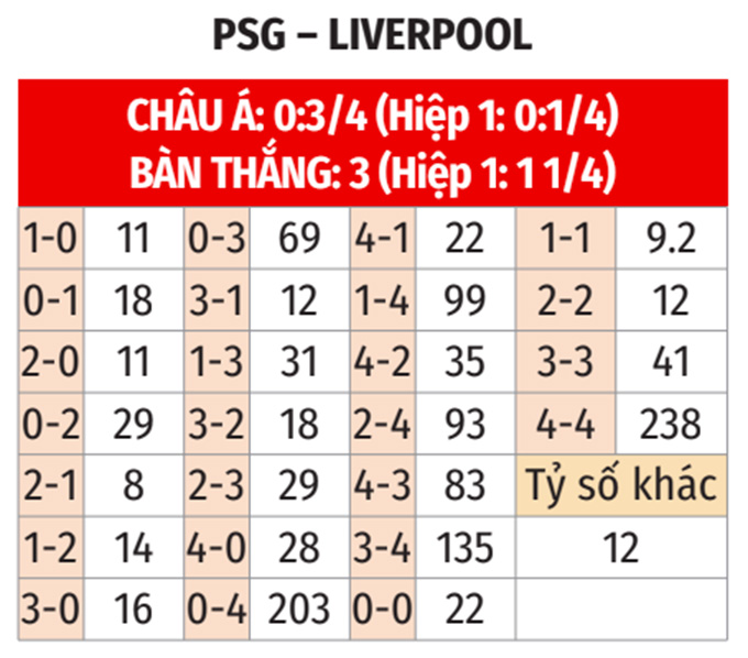 - Tối đa 4 thẻ phạt: 3/4 cuộc đối đầu gần nhất giữa hai đội và cả 4 trận vừa qua của PSG đều có dưới 4 thẻ phạt mỗi trận. Ngoài ra, 6/9 chuyến làm khách gần đây của Liverpool cũng chứng kiến không quá 4 thẻ phạt mỗi trận. Xem ra, trận này khó có ngoại lệ.