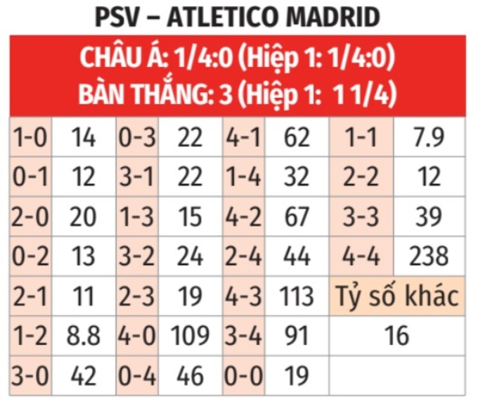 - Chẵn bàn thắng: 3/4 lần gặp giữa 2 đội gần đây kết thúc với tổng số bàn thắng là số chẵn. 4/5 trận gần đây của PSV tại Champions League và 5/7 trận sân khách vừa qua của Atletico xảy ra tình trạng tương tự.
