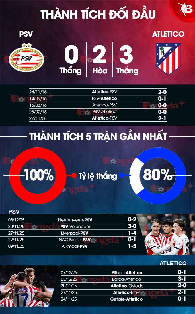 - Hai đội đều ghi bàn: PSV liên tiếp ghi bàn ở 16 trận đấu gần đây. Atletico cũng "nổ súng" ở 8/9 trận mới nhất.