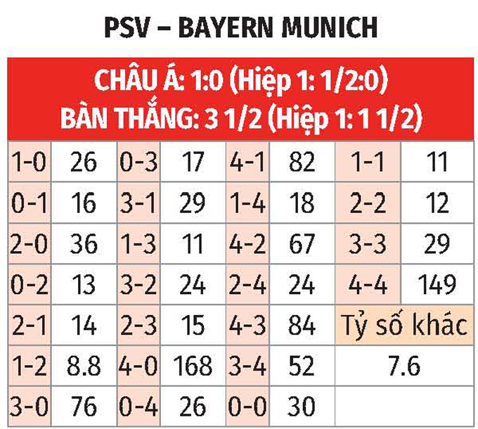 - Lẻ bàn thắng: 7/10 trận gần nhất của PSV có tổng bàn thắng không chia hết cho 2. Ngoài ra, 9/15 trận sân khách vừa xong của Bayern chứng kiến điều tương tự.