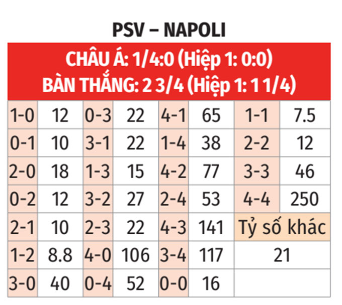 - PSV thắng hiệp 1 theo châu Á: PSV đang có chuỗi 3 trận thắng hiệp 1 liên tiếp theo châu Á. Tiếp đón Napoli thua hiệp 1 theo châu Á ở 3/4 trận gần đây, đội chủ nhà là sự lựa chọn đáng tin cậy.