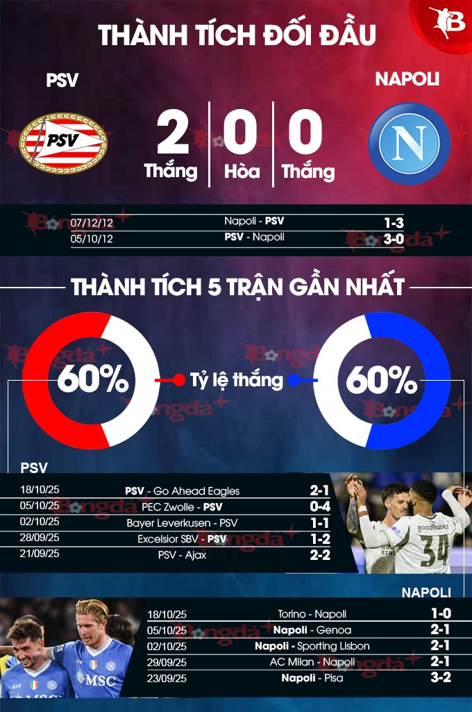 - Trên 2 bàn: 6/7 trận gần đây của PSV đều có tối thiểu 3 bàn. 4/5 trận vừa qua của Napoli và 2 cuộc chạm trán trước đây giữa 2 bên cũng diễn ra theo kịch bản tương tự.