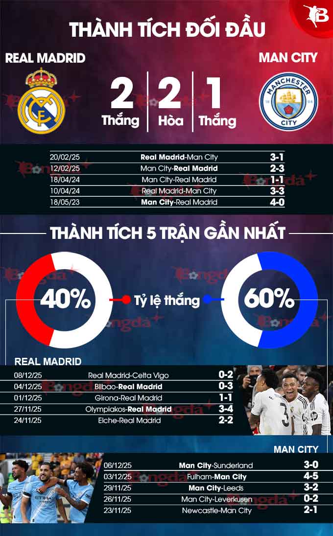 BONGDAPLUS dự đoán tỉ số Real Madrid vs Man City