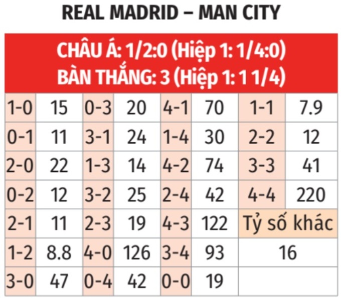 - Tối thiểu 2 bàn hiệp 1: 3 lần gặp giữa 2 đội gần đây có ít nhất 2 bàn thắng trong hiệp 1. Tình trạng tương tự xảy ra ở 4/5 trận sân nhà gần đây của Real Madrid tại Champions League và 5/7 trận vừa qua của Man City tại các giải đấu cúp.
