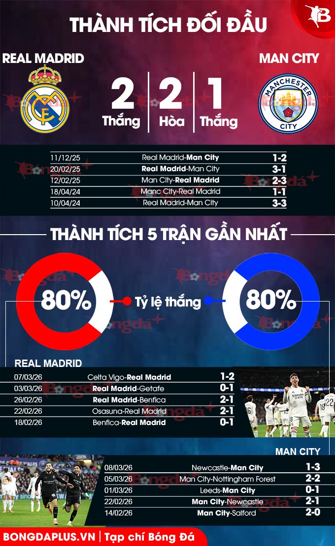 - Tối thiểu 3 bàn cả trận: 10/12 lần gặp giữa 2 đội gần đây kết thúc với tối thiểu 3 bàn thắng. Tình trạng tương tự xảy ra ở 3/4 trận gần đây của Real Madrid và 7/9 trận mới nhất của Man City.