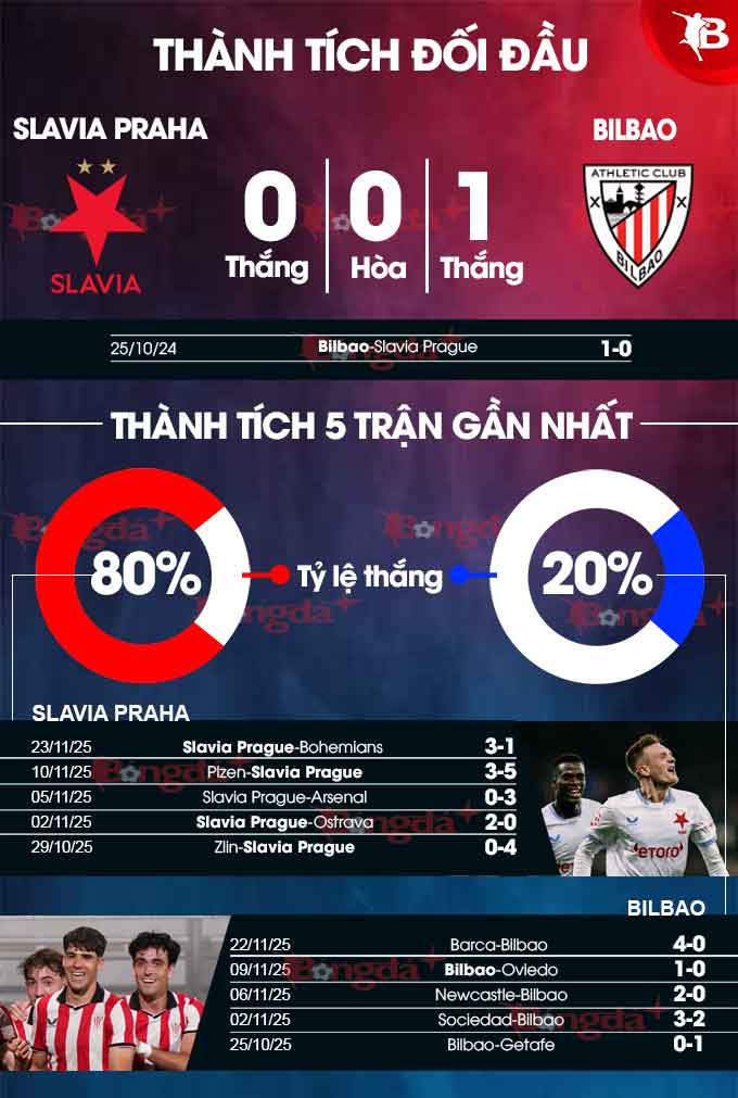 Cụ thể, trong khi Slavia Prague thắng 4/5 trận mới nhất thì Bilbao thắng 1/5 trận vừa qua. Slavia Prague có lợi thế sân nhà và đang chơi cực hay ở đây khi chỉ thua 1/5 trận gần đây