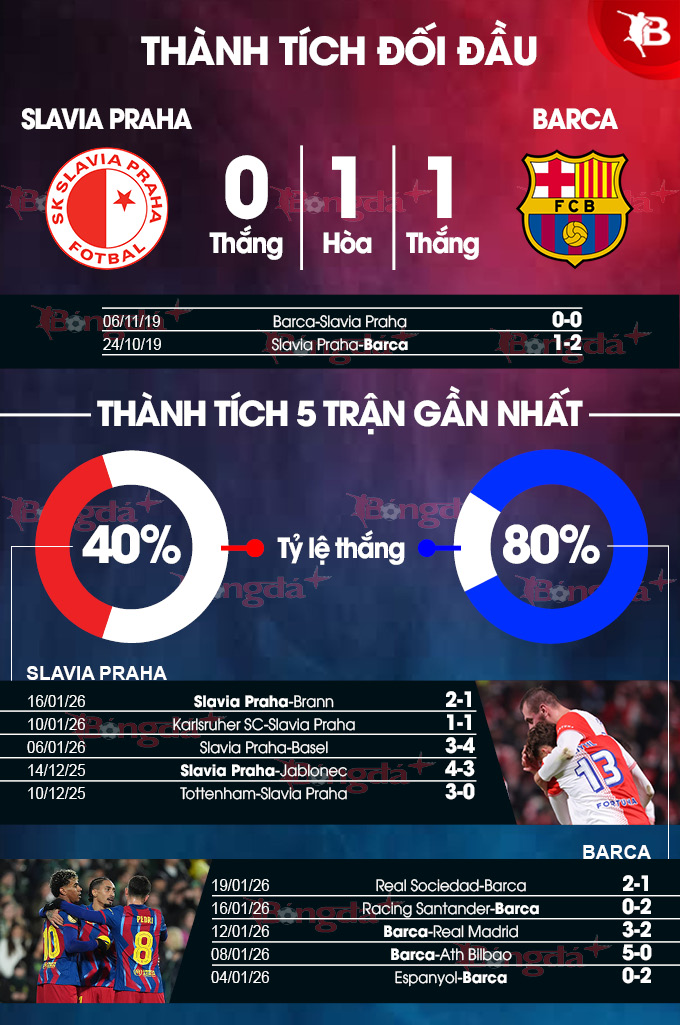Slavia Praha mới chỉ ghi 2 bàn sau 6 trận ở vòng phân hạng Champions League mùa này. Xét về khả năng tấn công thì họ đang là đội có thành tích tệ nhất giải đấu. Cũng cần phải nói thêm rằng, trong 15 lần chạm trán các đại diện Tây Ban Nha ở cúp châu Âu trước đây, Slavia Praha tỏ ra lép vế khi chỉ thắng được 2 mà để thua tới 7. Một trong số đó là thất bại 1-2 dưới tay chính Barca ngay trên sân nhà ở vòng bảng Champions League 2009/10.