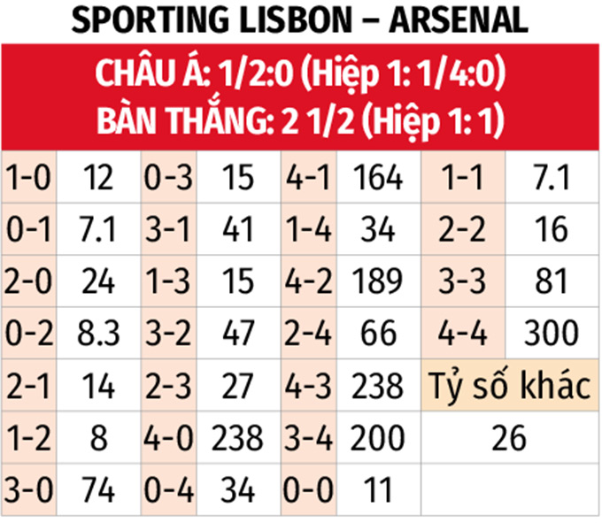 - Ít nhất 1 bàn hiệp 1: 5 trận liên tiếp gần đây của Sporting Lisbon đều có bàn thắng trong hiệp 1, với 3 trận có từ 2 bàn trở lên. 5/6 trận sân khách của Arsenal cùng 3 trận đối đầu gần nhất cũng có tối thiểu 1 bàn trước giờ nghỉ.