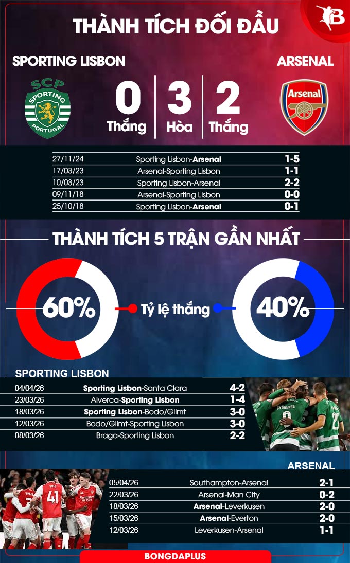 Dù chưa từng thắng Arsenal trong thời gian thi đấu chính thức sau 5 lần đối đầu (3 hòa, 2 thua), Sporting Lisbon vẫn có thể lạc quan về khả năng đánh bại Pháo thủ, khi được tiếp thêm động lực từ phong độ sân nhà ấn tượng với 17 trận gần nhất toàn thắng. Mà trình diễn bùng nổ của Sporting Lisbon tại Champions League phần lớn được xây dựng dựa trên thành tích đáng nể của họ trên sân nhà Jose Alvalade, khi giành chiến thắng cả 5 trận.