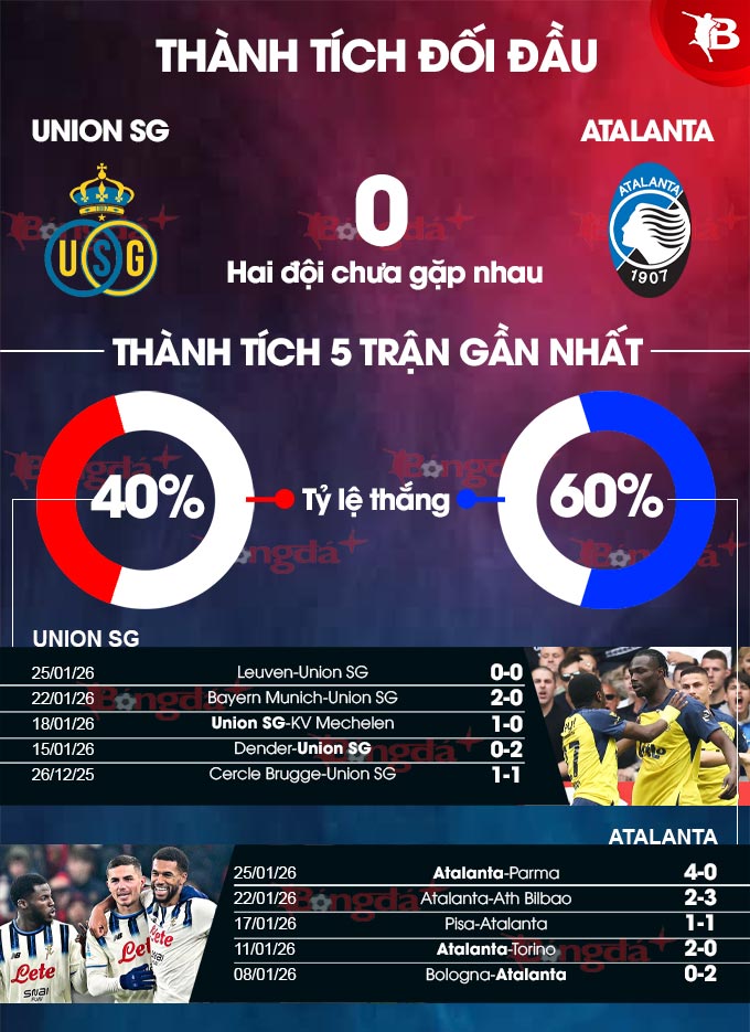 Union SG có thể tự tin nhờ phong độ ấn tượng ở giải quốc nội, khi đội bóng Bỉ hiện dẫn đầu BXH, nhưng bề dày thành tích châu Âu và thành tích sân khách mạnh mẽ của Atalanta sẽ giúp họ chiếm ưu thế.