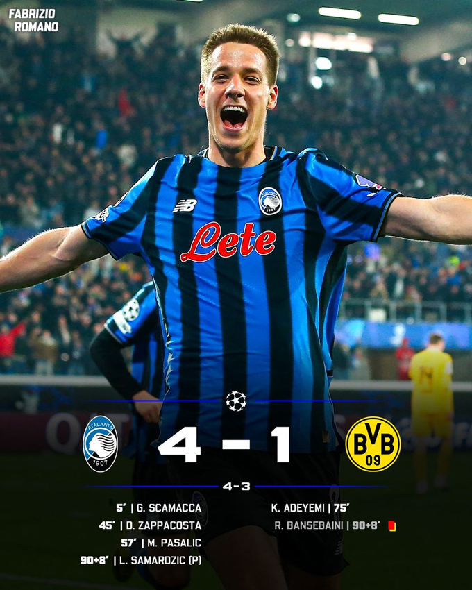 Phút 75, Adeyemi ghi bàn rút ngắn cách biệt xuống còn 1-3 cho Dortmund. Tới phút 90+7, Scalvini bên phía Atalanta cùng Schlotterbeck và Bensebaini bên phía Dortmund phải nhận thẻ đỏ. Và phút 90+8, Samardzic ghi bàn trên chấm 11m ấn định chiến thắng 4-1 cho đại diện của Italia.